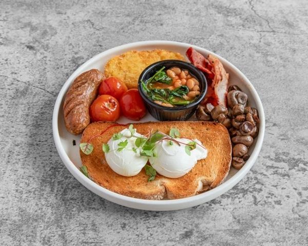 Smoked bacon, local sausage, baked beans w. spinach, hash brown, roasted garlic mushrooms, grilled cherry tomatoes, eggs your way & sourdough [Vg*, Gf*, Nf]