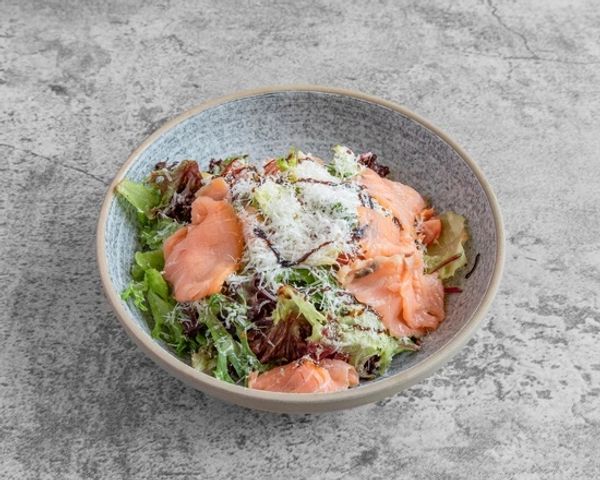 Smoked salmon served w. sliced fresh pear, leafy greens, cherry tomatoes & grated parmesan tossed in a light citrus dressing & served w. a drizzle of aged balsamic